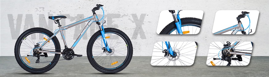 The VantageX from the Xtreme Series is a 27.5 hardtail fat bike sporting hi-traction,3" width tyre to take on all kinds of terrain. Engineered with carbon hi-tensile steel, zero active shock suspensions, and 21-speed Shimano gears, and a front fork suspension to ensure high-level comfort. The VantageX sports disc brakes and rims are made of double walls and from rust-free alloy. You can choose from three brilliant and contrasting colour combinations of black-orange, black-yellow, and grey-blue. The water-resistant decals and the colour-coordinated seats and wires make the VantageX a stunner.
