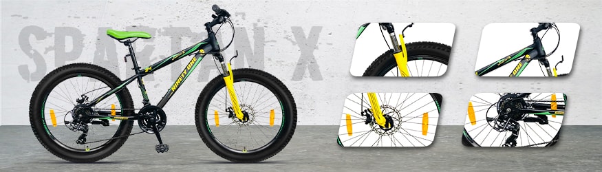 Another great Fat bike, the SpartanX is available in size 24 and engineered from carbon steel that you are sure to find easy to handle and maneuver. The SpartanX sports zero shock active suspensions and 21-speed Shimano gears. Safety in mind, the Spartan comes with high-quality JAK 7 F/R Mechanical Disc Brakes. And double-wall rust-free alloy rims that hold the hi-traction 3" wide tyres. This bike is a hardtail, and the fork suspension has a 60 mm travel, just as required for your adventure rides. The SpartanX has got it all - superb specs in a magnificent-looking vehicle. Yes, the SpartanX comes in two colour combinations of black-green and blue-yellow. The decals on each are striking and set up well with the colour coordinated seats and wires.