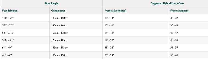 Once done, refer to the following hybrid bicycle size chart to determine your perfect fit: