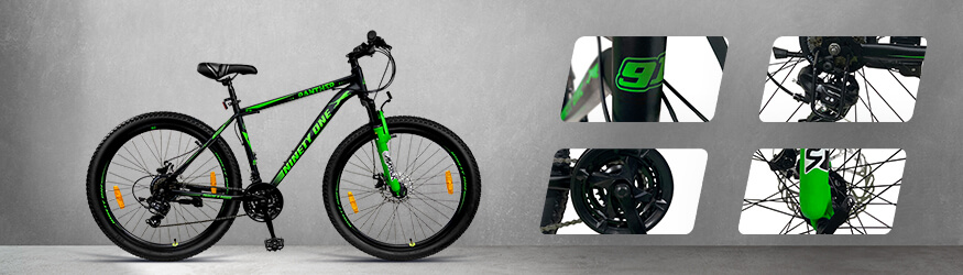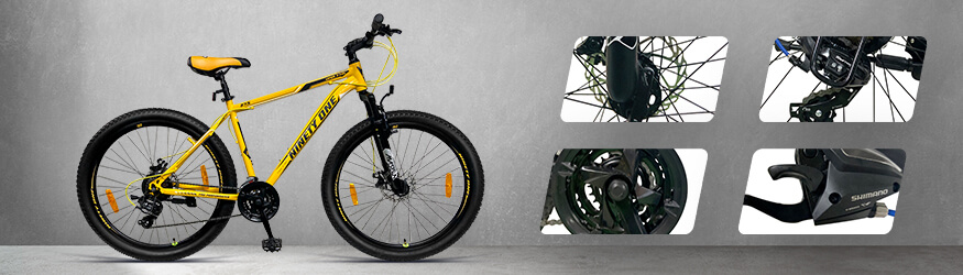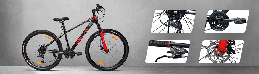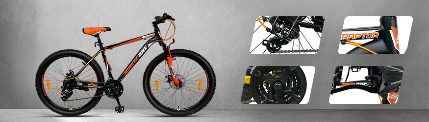 Another great MTB that is easily one of the most value for money rides is the Raptor 26 T. A 26er built with a durable carbon steel frame and comes equipped with 21 Hi-Speed Shimano gears is ideal for new entrants to mountain biking. This mountain bike has mechanical disc brakes at the front and rear and comes equipped with shock-free suspensions. No-trouble double alloy rust-free rims hold DSI Hi-traction 2.2" wide tyres. You have a choice of four eye-catching looks to choose from - black-orange, red-yellow, yellow, and green. True to its name, like a bird of prey, it's swift. Feel free with a Raptor 26T.