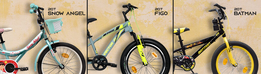 - FIGO 20T: This is the perfect cycle for boys and comes in two beautiful colours: black turquoise and gray yellow. The ideal partner for a thrilling adventure, this bicycle boasts life-long durability of carbon steel, rapid and robust power V brakes, double-wall rust-free alloy rims, and zero shock suspension. These are only a few features of this power-packed bicycle. The striking colours and stylish appearance only amplify the beauty of this bicycle.